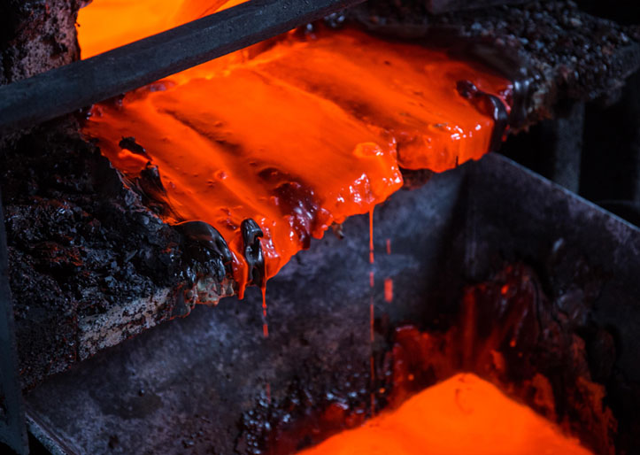 火法冶煉,揮發(fā)焙燒銻氧粉,反射爐還原產(chǎn)出粗銻錠。